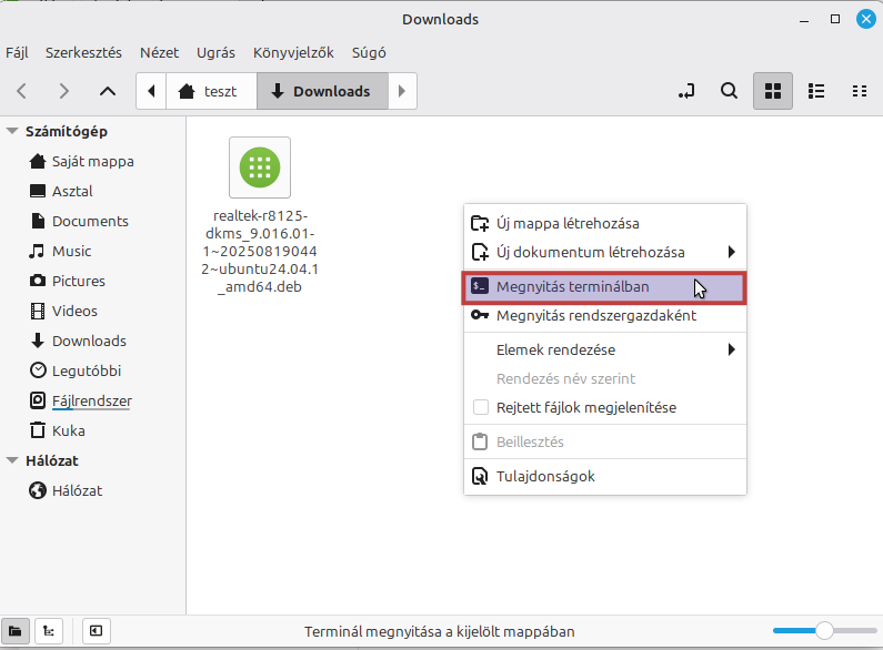 A Minten a fájlkezelőben, ott ahol a fájl van, kattintanék egy üres területen az egér jobb egérgombjával és a „Megnyitás terminálban” lehetőséget választanám,