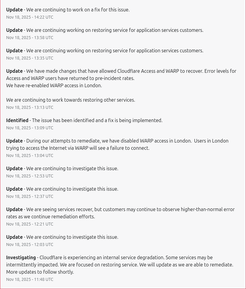 2025. november 18-án világszerte akadozott az internetforgalom, miután a Cloudflare hálózata 11:20 UTC körül súlyos hibákat kezdett mutatni. A probléma miatt több millió felhasználó találkozott 5xx HTTP-hibaoldalakkal, számos weboldal és szolgáltatás pedig részben vagy teljesen elérhetetlenné vált. A vállalat közlése szerint a kimaradást nem kibertámadás, hanem egy adatbázis-jogosultságkezelési módosítás okozta. A hibás beállítás következtében a Bot Management rendszerhez tartozó úgynevezett „feature fájl” mérete a kétszeresére nőtt, ami már meghaladta a hálózati forgalomirányító szoftverek által elfogadható határértéket. A modul ezért összeomlott, és hibaválaszokat adott minden olyan kérésre, amely áthaladt rajta.