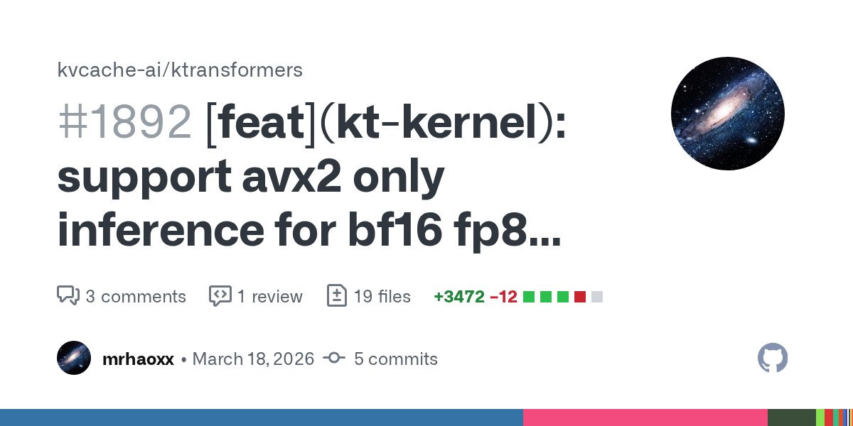 Ez a pull request vezette be nemrég az AVX2-es inferencia támogatását a kt-kernel számára. Ez az új dokumentációösszefoglalja, hogyan futtatható a KTransformers AVX2-es processzorokon.