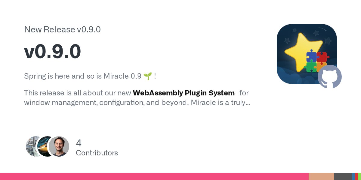 A Miracle-WM 0.9 egy WebAssembly-alapú plug-in rendszert vezet be, amellyel a window management, az animációk, a beállítások és még sok más testre szabható. Mivel a plug-ineket WASM payloadként tölti be, a megoldás várhatóan biztonságosabb és hordozhatóbb az alternatíváknál. A Miracle-WM fejlesztője, Matthew Kosarek videót is közzétett a WASM plug-inek működéséről: