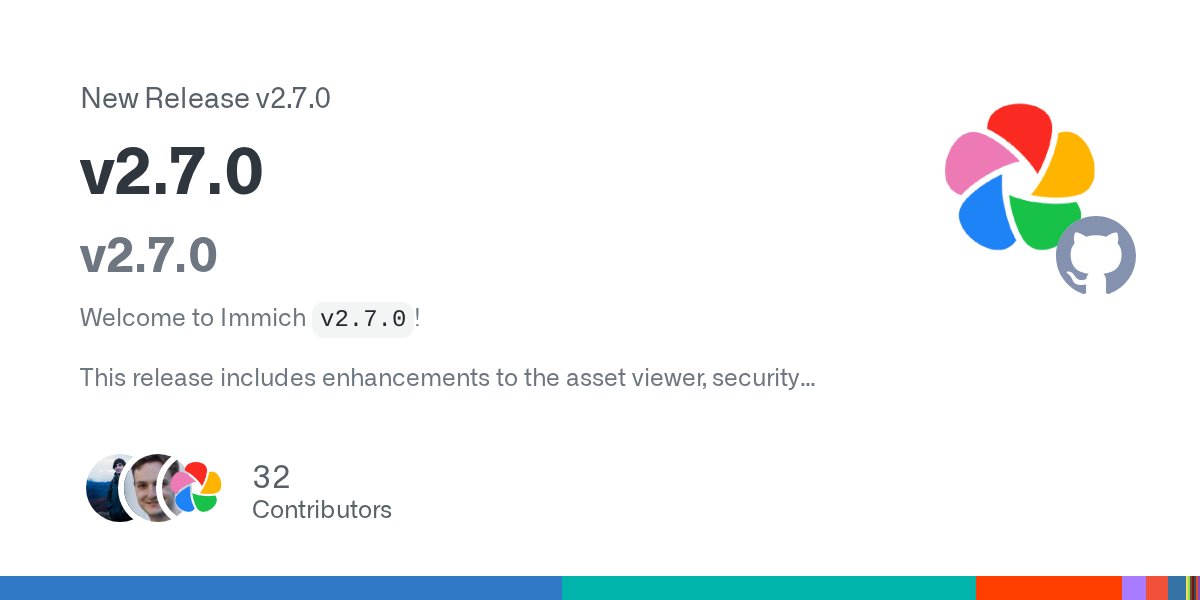 Az Immich 2.7 további újdonságai közé tartozik a .ts fájlok támogatása, a people oldal lekérdezéseinek gyorsítása, egy előnézet gomb a képkiválasztáshoz, valamint számos hibajavítás a metaadat-kinyerés, az adatbázis-visszaállítások, az időzóna megőrzése, a térképnézet működése, a feltöltési összesítések, a WebM konténer felismerése, a személynév-keresés és több mobilos UI-probléma területén.