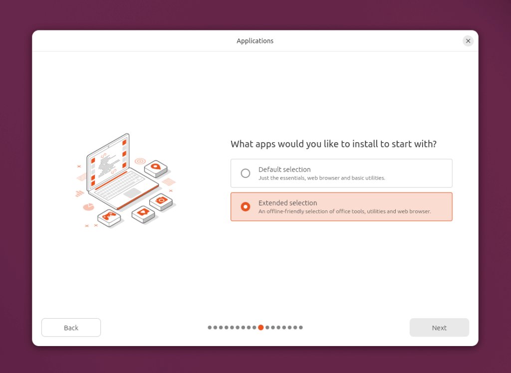 Akik viszont azt szeretik, ha a LibreOffice, a Thunderbird, a Transmission és más alkalmazások már az első indításkor készen állnak, azoknak a telepítő továbbra is felkínálja az „Expanded Selection” opciót. Ezzel egy olyan rendszert kapunk, amely a mindennapi feladatokhoz szükséges szoftvereket is tartalmazza.