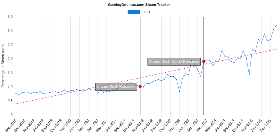 Amint azt a dedikált Steam Tracker rendszeren is látni lehet, a Linux felhasználói aránya a Steam-en már 2024 szeptembere óta 2% felett van, és 2021 szeptemberében volt meg az 1%. Tehát 2024-ben még 3 évre volt szükség az egy százalékos növekedéshez, míg idén ez már egy év alatt megvolt, ami az eddigiek alapján gyorsuló, emelkedő trendnek tűnik