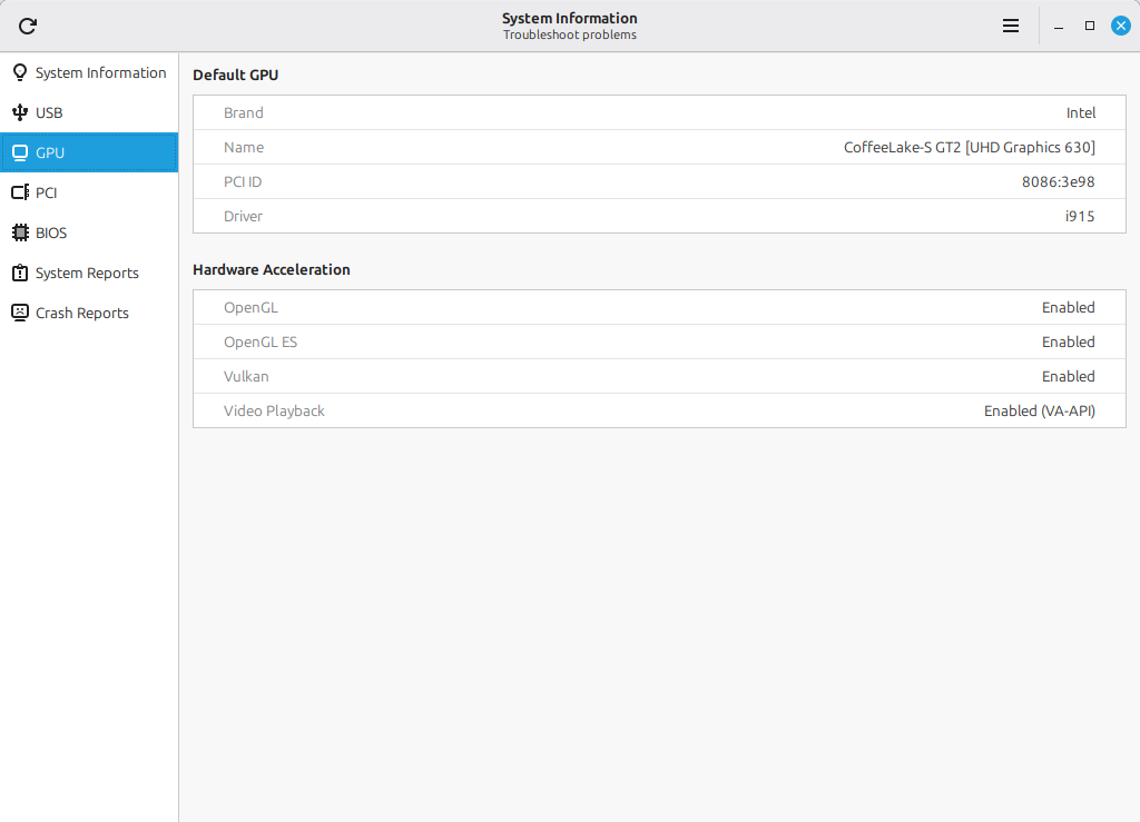 A „GPU” oldal megjeleníti az alapértelmezett grafikus kártyára vonatkozó információkat, valamint azt is, hogy az adott eszköz milyen mértékben támogatja a hardveres gyorsítást (hardware acceleration).